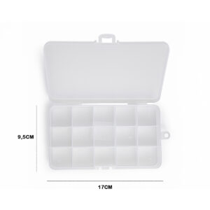 Caixa organizadora com 12 divisórias, ideal para guardar miçangas, botões, fitilhos e pequenos acessórios de papelaria. Leve, resistente e com tampa segura — perfeita para manter tudo no seu lugar no ateliê!